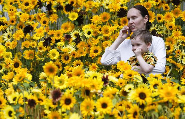 مادر و فرزند در میان گل های آفتابگردان به نمایش درآمده در خیابانی در توکیو