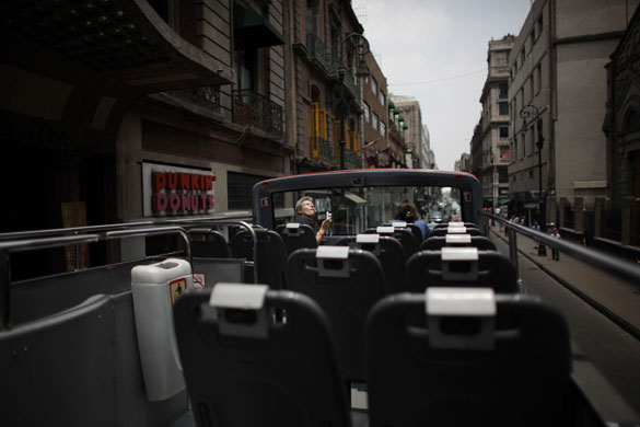 عکاسی یک توریست هلندی از بناهای شهر مکزیکو سیتی از روی یک اتوبوس دو طبقه که سقف آن را برداشته اند .این اتوبوس ها امروزه وسیله ای خوب برای گردادن گردشگران در کشورهای مختلف دنیاست